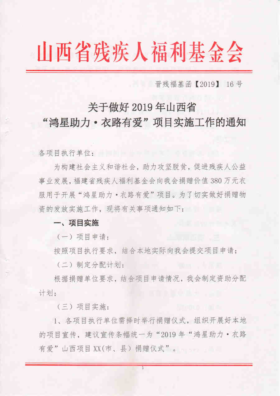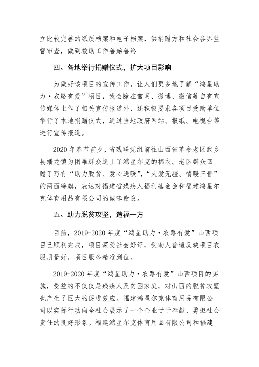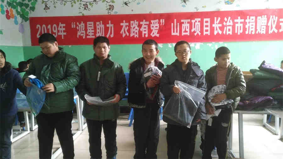 2020年1月15日,山西省残疾人福利基金会在山西省革命老区武乡县蟠龙镇举行鸿星尔克爱心助困捐赠仪式,仪式分别在老凹村村民委员会和祥良村党组党群服务中心举行。省残联党组成员、副理事长吴波、省残联党组成员、副理事长李俊温参加了这次的捐赠活动,在捐赠活动现场为两村154户困难群众送上了价值10万余元的鸿星尔克捐赠的棉衣。两村群众代表向福建省残疾人福利基金会赠送了写有“助力脱贫、爱心送暖”、“大爱无疆、情暖三晋”的锦旗,以表示福建省残疾人福利基金会捐赠衣服的感谢,锦旗由山西省残疾人福利基金会秘书长董先代为接受。