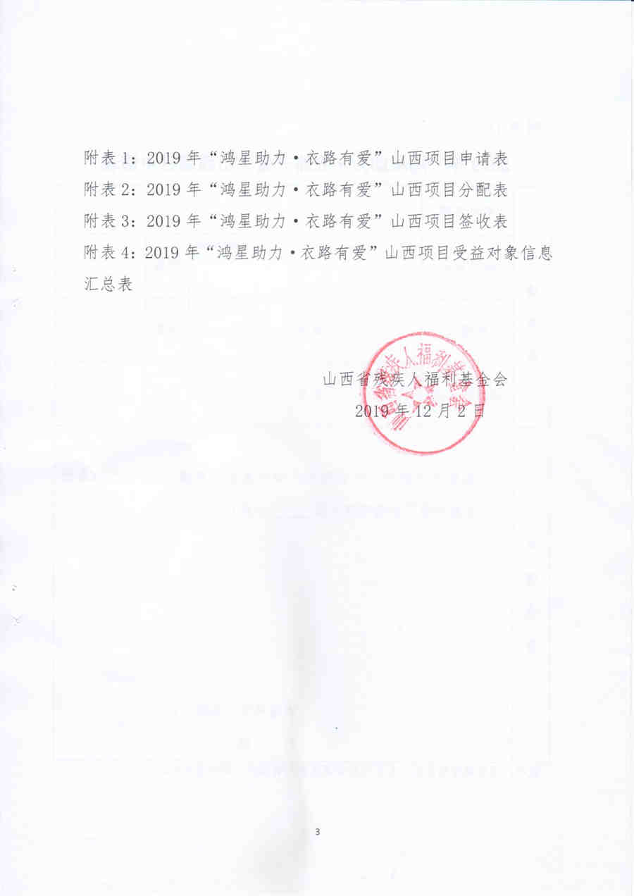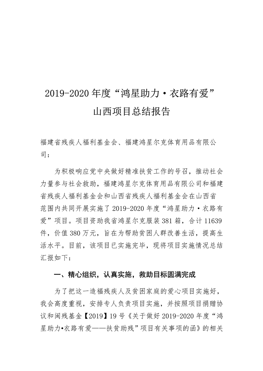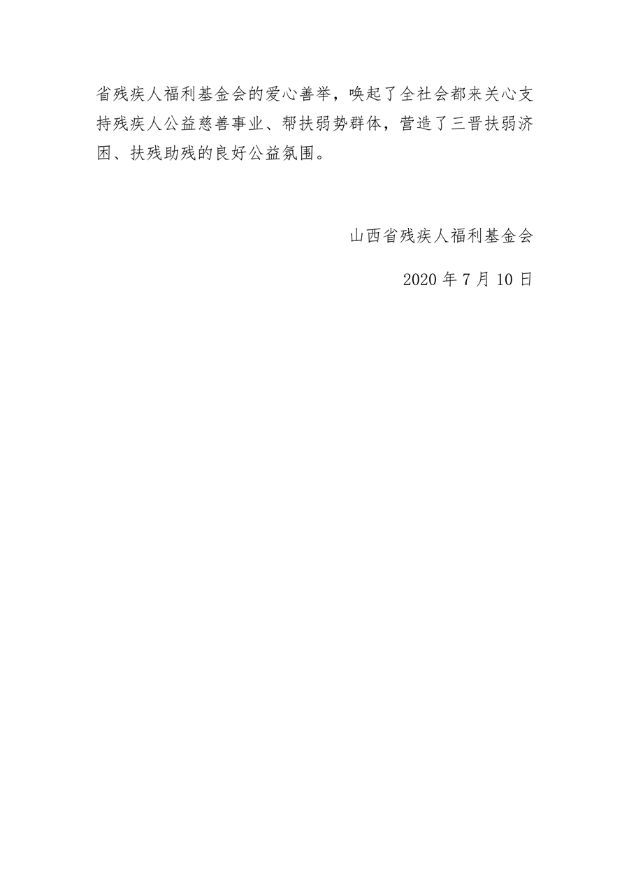 2020年1月15日,山西省残疾人福利基金会在山西省革命老区武乡县蟠龙镇举行鸿星尔克爱心助困捐赠仪式,仪式分别在老凹村村民委员会和祥良村党组党群服务中心举行。省残联党组成员、副理事长吴波、省残联党组成员、副理事长李俊温参加了这次的捐赠活动,在捐赠活动现场为两村154户困难群众送上了价值10万余元的鸿星尔克捐赠的棉衣。两村群众代表向福建省残疾人福利基金会赠送了写有“助力脱贫、爱心送暖”、“大爱无疆、情暖三晋”的锦旗,以表示福建省残疾人福利基金会捐赠衣服的感谢,锦旗由山西省残疾人福利基金会秘书长董先代为接受。