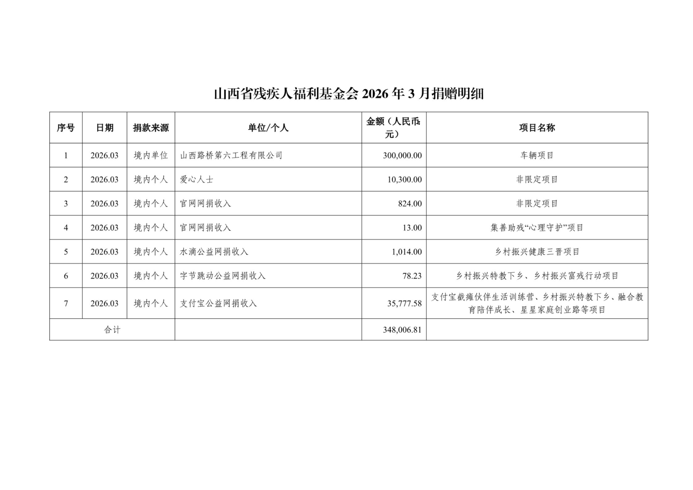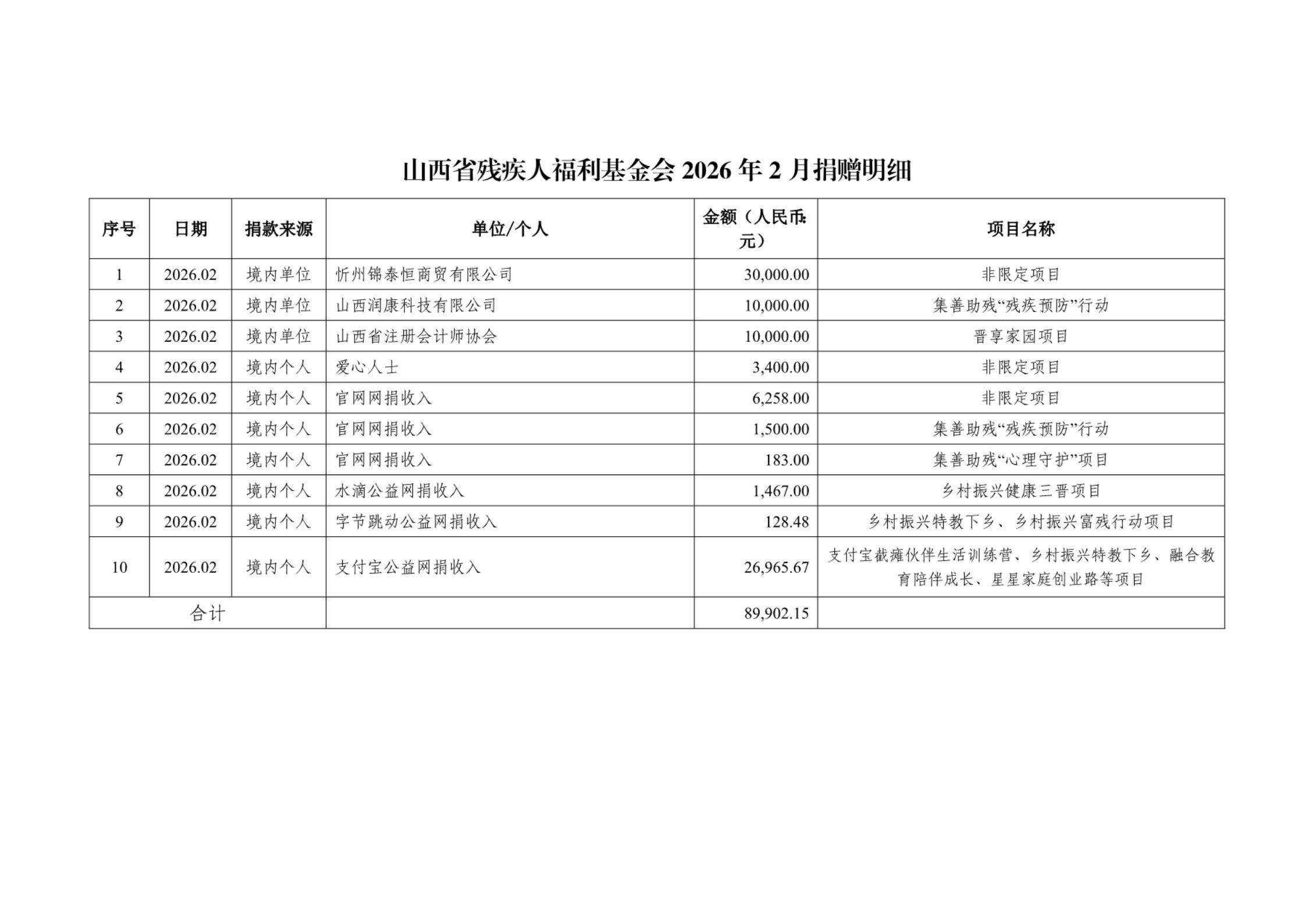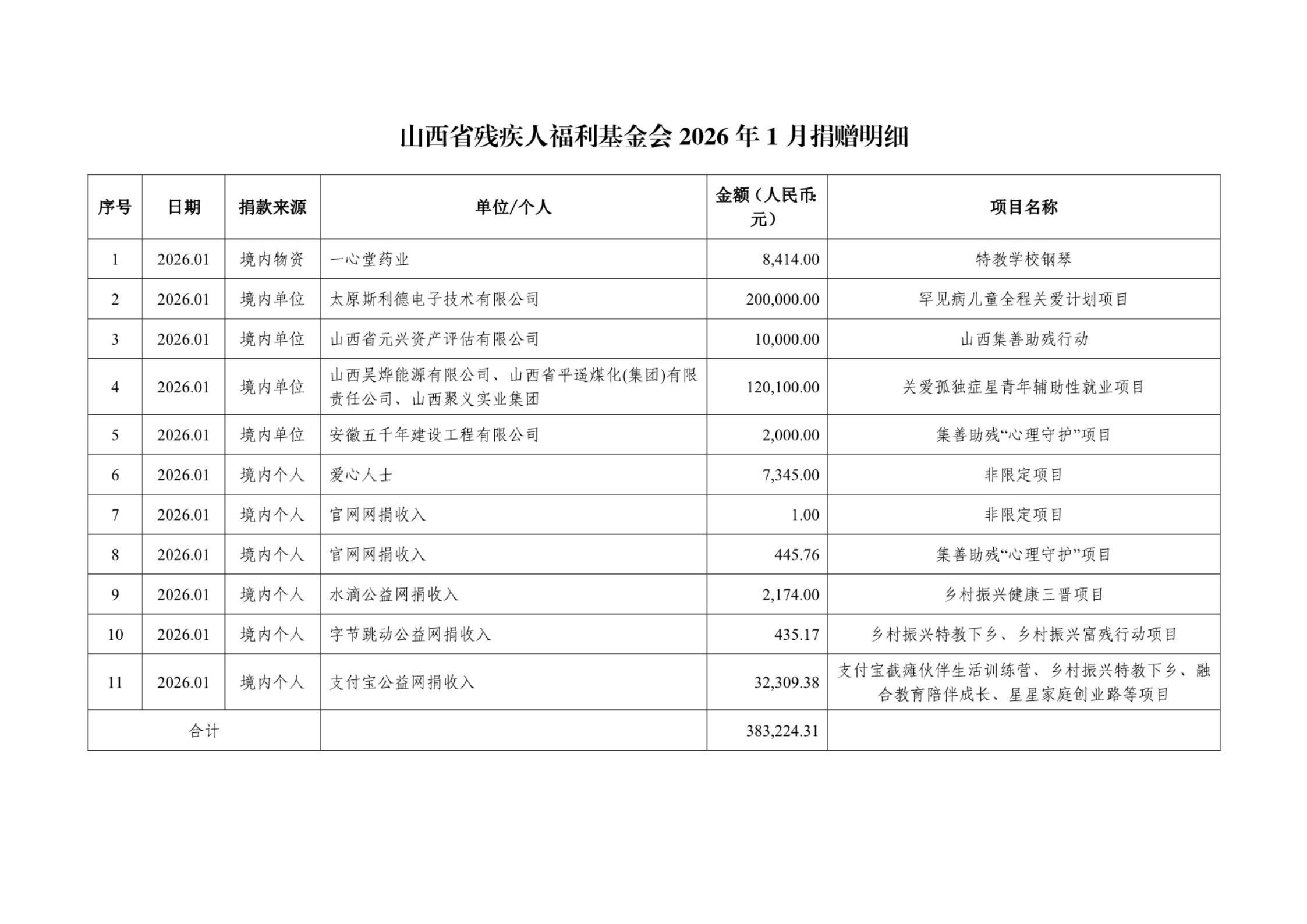 2026年第一季度捐赠明细